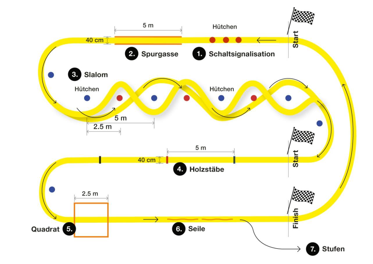 Auf vorgegebener Linie genau bis zum Stand bremsen. Mit der richtigen Pedalstellung losfahren und die Schaltung bei der Schaltsignalisation (Hütchen) einsetzen.