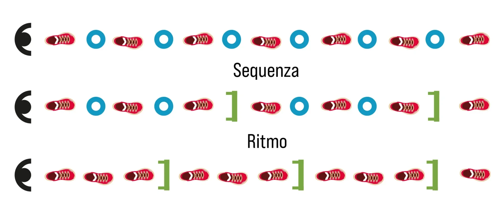 Gli atleti corrono saltando gli ostacoli (coni o altri oggetti) e mantenendo un ritmo regolare. Proponi la sequenza seguente: