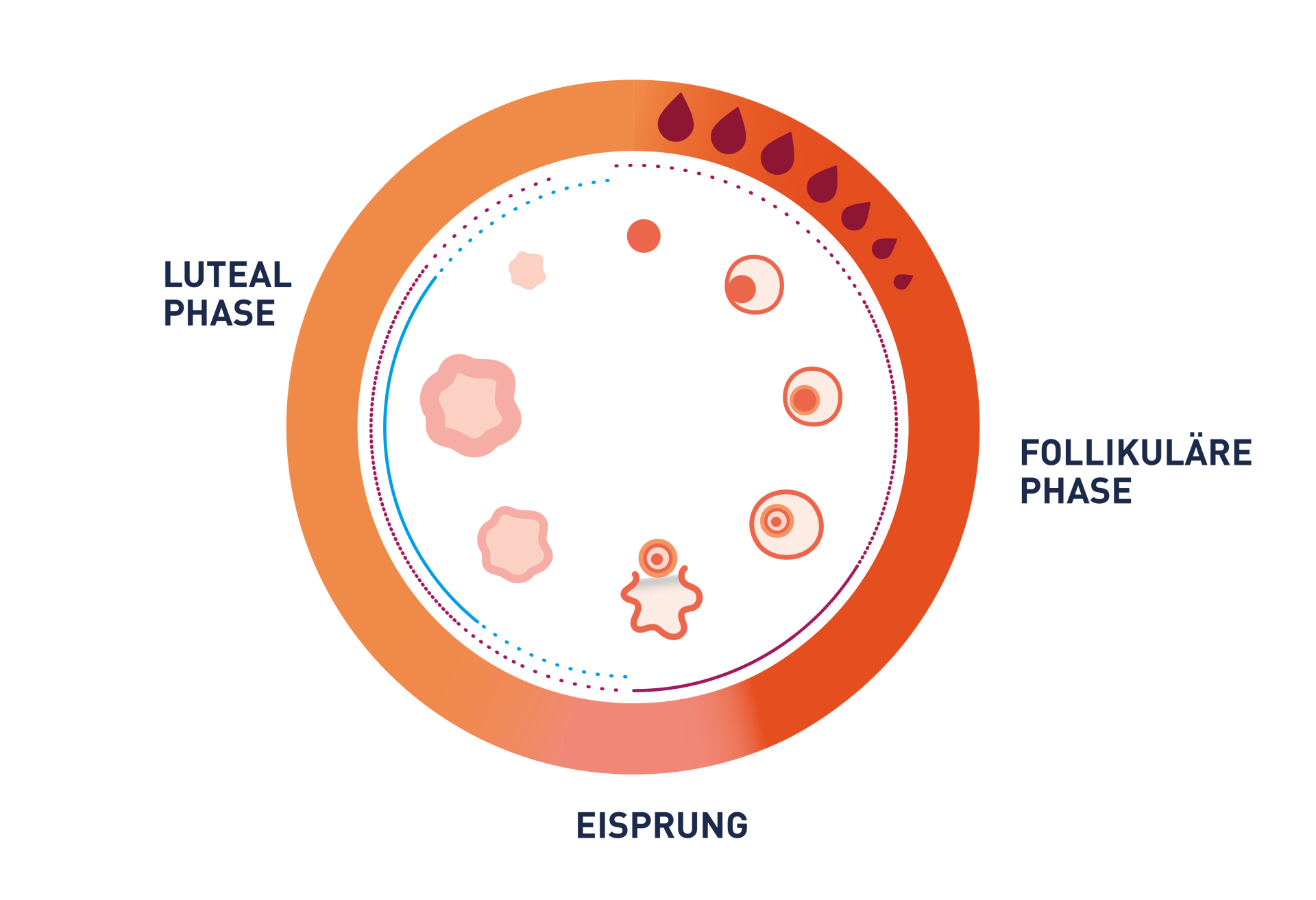 Der Menstruationszyklus besteht aus zwei Hauptphasen, die durch den Eisprung voneinander getrennt sind (siehe Abbildung). Jede dieser Phasen hat spezifische Auswirkungen auf den Alltag und das Wohlbefinden.