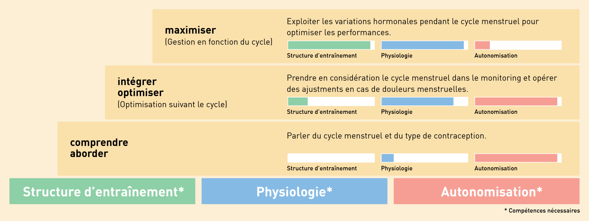 Conduire l’entraînement de manière systématique en fonction de la situation hormonale, en anticipant les variations du cycle et en planifiant les charges d’entraînement en conséquence. Cette étape demande un suivi individualisé.
