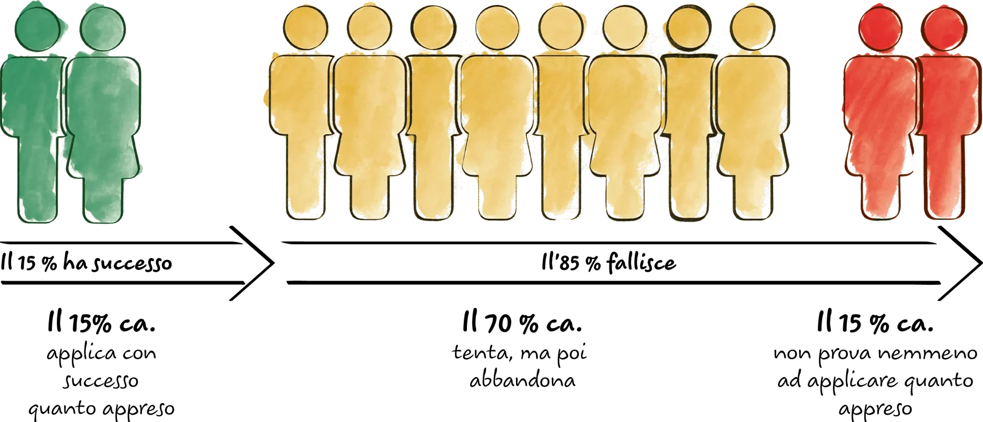 Questo bilancio piuttosto deludente è stato stilato dal professor Brinkerhoff, uno dei massimi esperti nel campo dell’efficacia e della valutazione dei processi di apprendimento e sviluppo. Dimostra chiaramente che una buona formazione da sola non è sufficiente. Fondamentale è il modo in cui conoscenze e competenze vengono messe in pratica.