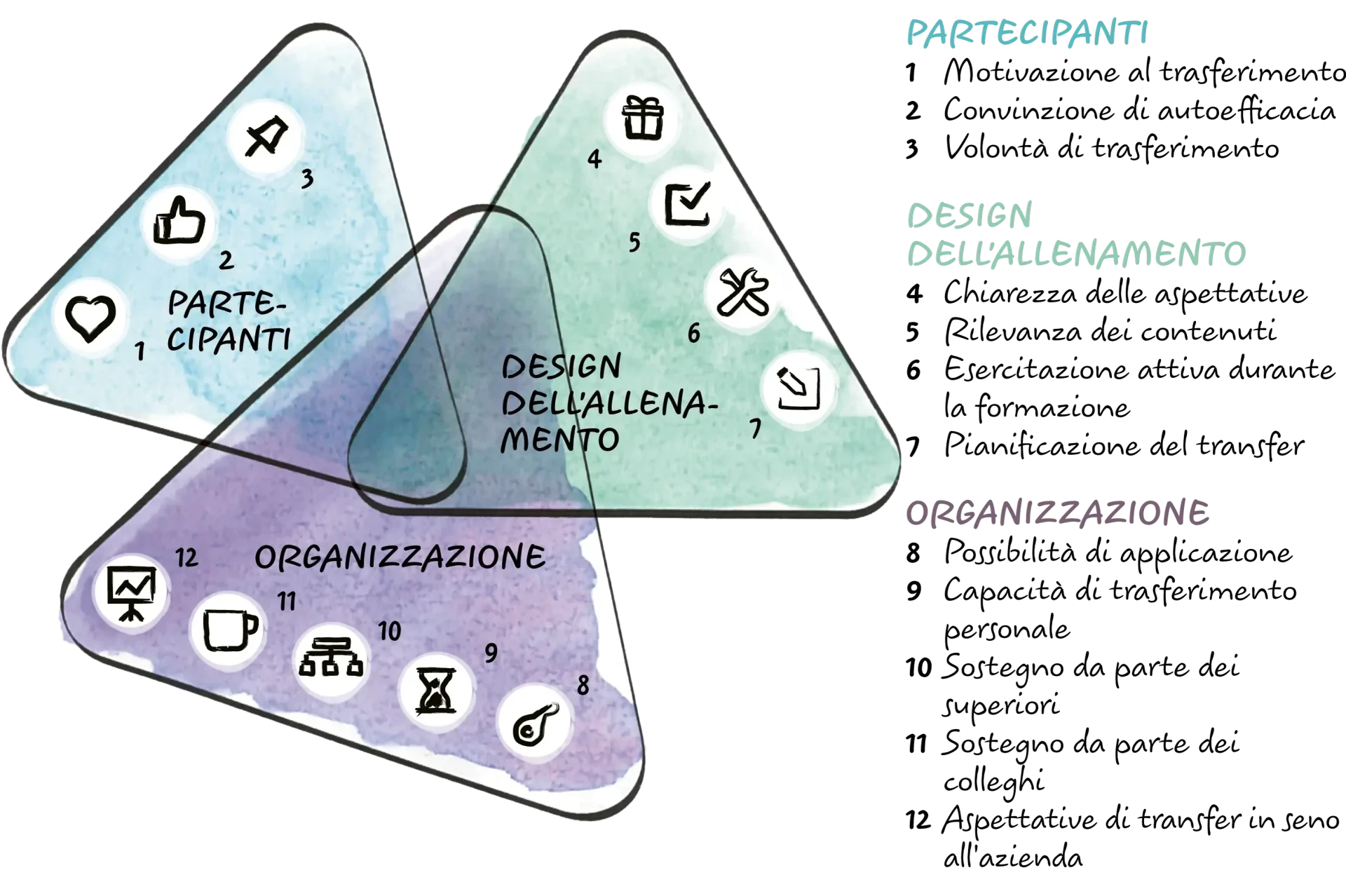 La dott.ssa Ina Weibauer-Heidel, dell’Institute for Transfer Effectiveness, ha composto queste conclusioni in un modello pratico e chiaro: descrive dodici fattori (leve) concreti che contribuiscono puntualmente al trasferimento di conoscenze, abbinandoli a consigli pratici su come agire nella pratica.