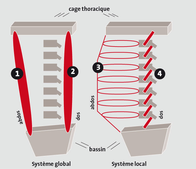 Les muscles globaux – longs, superficiels et puissants – interviennent au niveau des mouvements primaires et de l’équilibre. Les muscles du système local – courts et plutôt endurants – se trouvent le plus souvent près des articulations et sous les muscles globaux. Ils agissent au niveau de la stabilité des articulations et du contrôle moteur des différents segments de la colonne vertébrale.