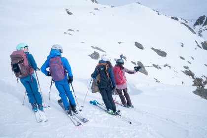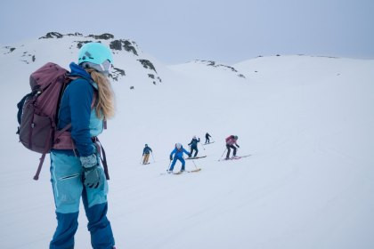 Gute Skitourengängerinnen können in unterschiedlichem Gelände sicher abfahren. Sie passen Tempo und Schwungformen situativ an. So finden sie eine gute Balance zwischen einer spielerischen, freudigen Abfahrt und einer defensiven Fahrweise an heiklen Stellen.
