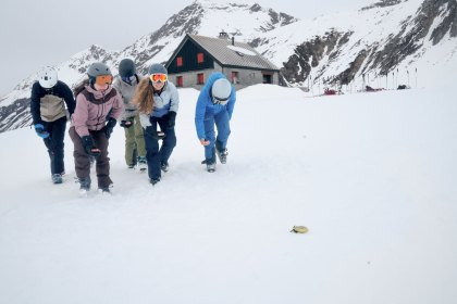 Die Jugendlichen lernen, wie sie mit dem Schneeförderband ein Lawinenopfer effizient bergen. Die Jugendlichen lernen, wie sie mit dem Schneeförderband ein Lawinenopfer effizient bergen.
