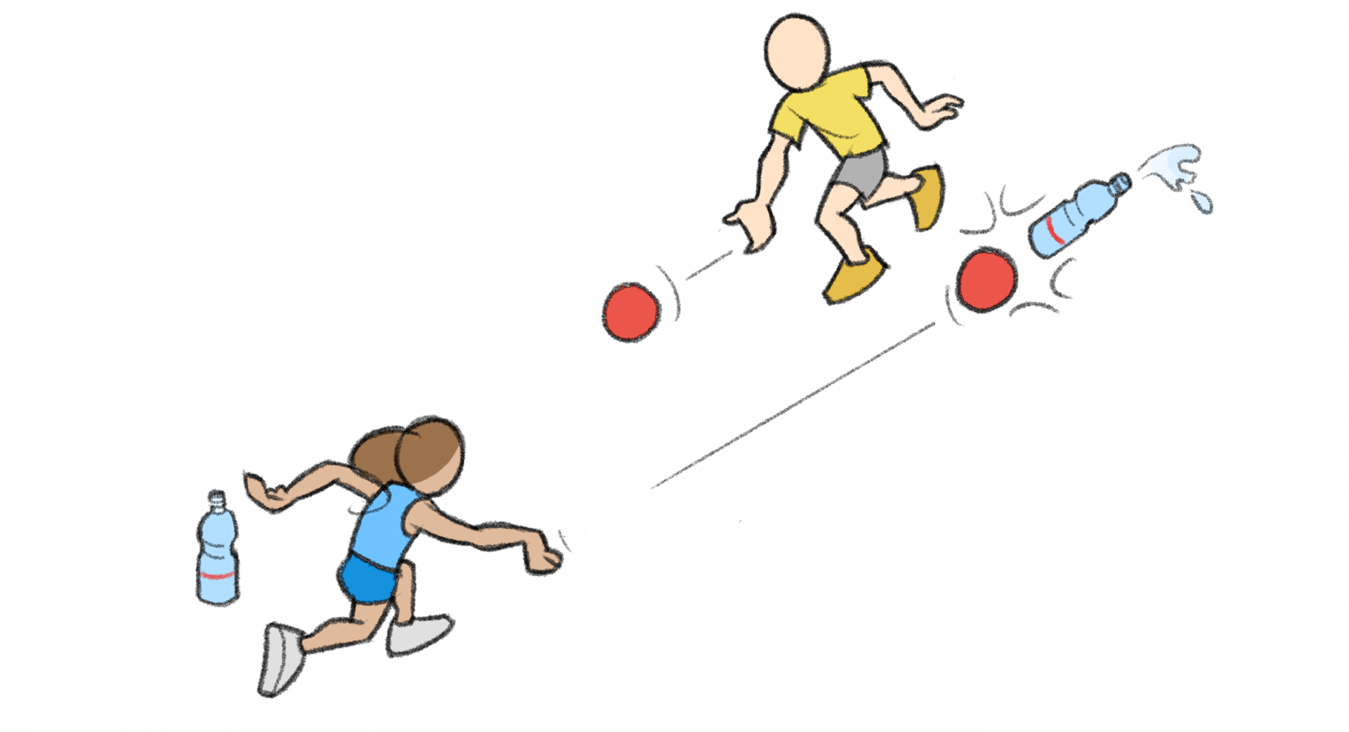 Deux enfants posent chacun une bouteille en PET remplie d’eau (sans bouchon) à une distance convenue. Le but est de vider la bouteille de l’adversaire en la renversant à l’aide d’une balle, comme au bowling. Il est interdit de protéger sa bouteille. Quand la bouteille tombe, le joueur récupère sa balle, redresse la bouteille et effectue un nouvel essai. Le premier qui vide la bouteille de l’adversaire jusqu’à une certaine marque (impossible de la vider complètement) a gagné.
