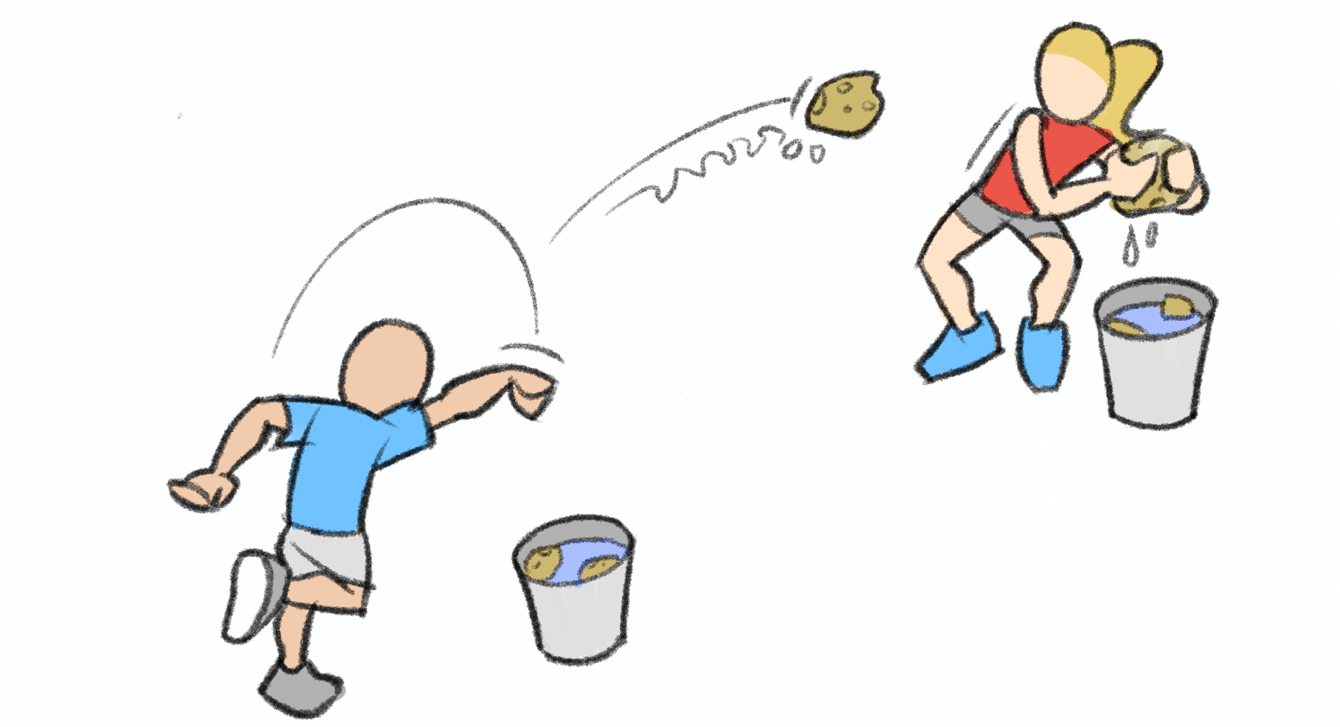Des sauts remplis d’eau et plusieurs éponges: les ingrédients sont réunis pour lancer une bataille d’éponges où chacun joue pour soi.