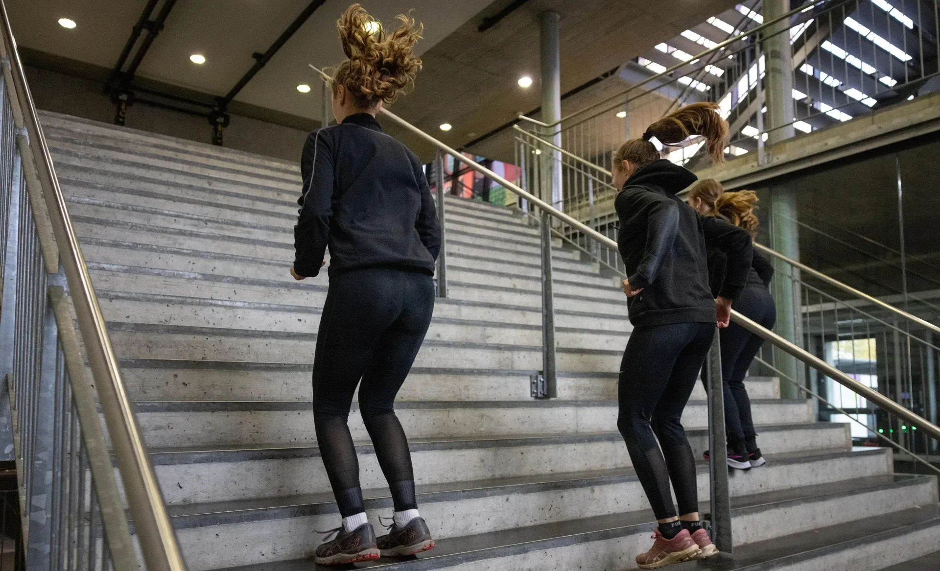 Les athlètes montent un escalier de dix à vingt marches le plus rapidement possible. Ils franchissent une marche à la fois.