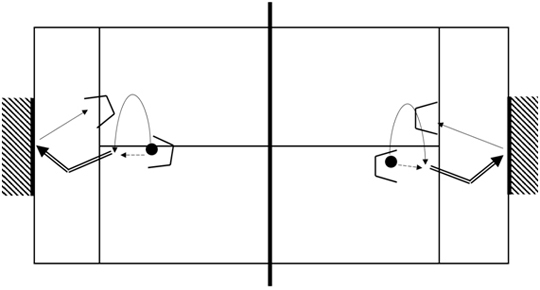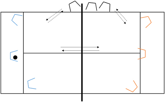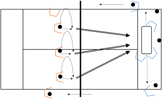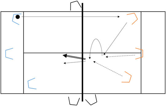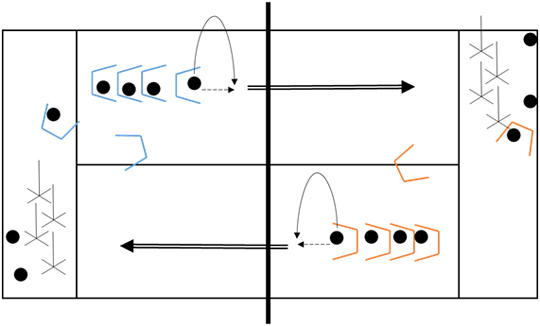 Cet exercice permet d’entraîner une phase d’attaque complète, suite à un service.