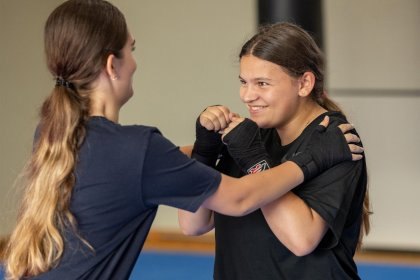 Die Boxer/innen treffen die erlaubten Ziele sanft in der Rückwärtsbewegung oder mit Seitwärtsschritten.