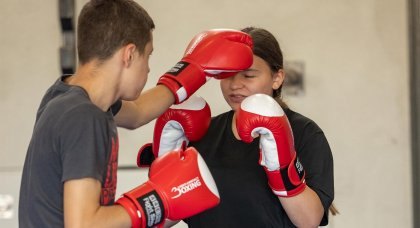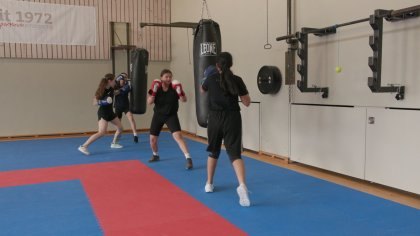 Die Boxer/innen kräftigen Rumpf und Schultern als Voraussetzung für eine stabile Boxstellung. Durch die aufgelegten...