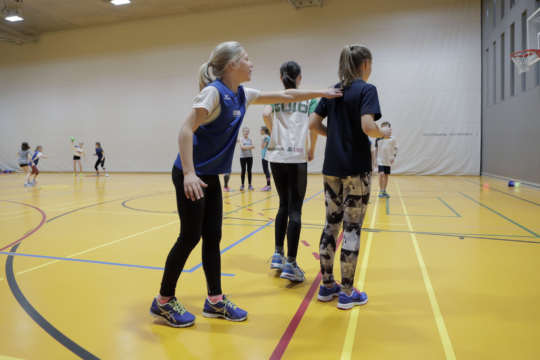Mit Basketball-Elementen lassen sich in diesem Aufwärm-Spiel Punkte skoren. Pässe werden via Brett gespielt.
