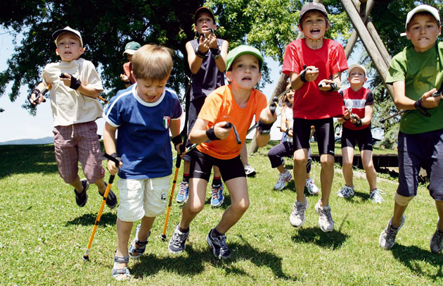 Die Kinder verbessern die Ganzkörpermobilität indem sie bei dieser Übung ihre Stöcke zu Hilfe nehmen....