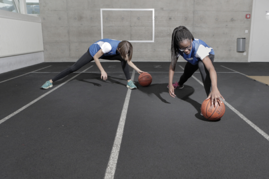 Avec un ballon, les jeunes réalisent des exercices d'étirement dynamique global.