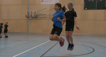 Die Schülerinnen und Schüler üben sich in verschiedenen Sprungformen zur Steigerung der Belastbarkeit sowie zur...