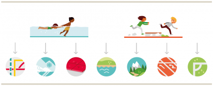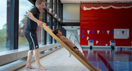 I bambini sperimentano scivolate e slittamenti e allenano in maniera ludica l’ingresso in acqua.