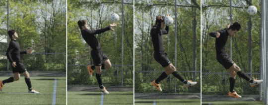 Colpire con la fronte la palla dopo una rincorsa dinamica e uno stacco su un...