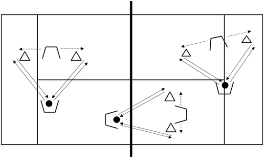 Questo esercizio permette di allenare l’intera fase d’attacco dopo un servizio.