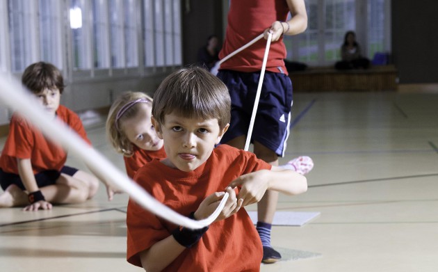Gli allievi allenano la forza delle gambe in piccoli gruppi. Questo esercizio ludico è un...
