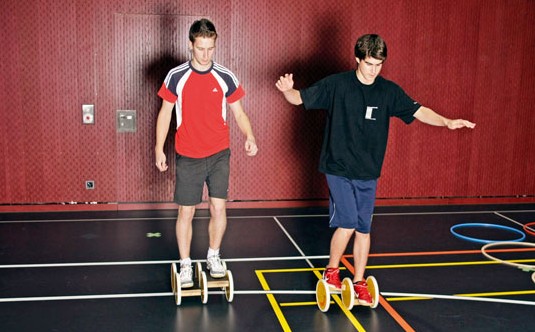 Un esercizio che permette agli allievi di allenare il loro equilibrio divertendosi su un asse...