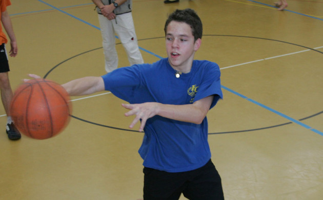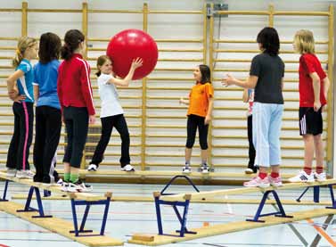 Gli allievi gettano un pallone da pallacanestro al di sopra di una corda. Grazie a...