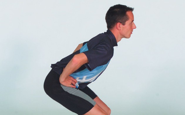 In posizione eretta e divaricare le gambe. In questo esercizio si piegano i glutei indietro...