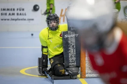 In posizione da hockey, spostando il peso, i bambini e i giovani imparano a controllare...