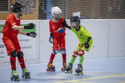 Giocatrici e giocatori pattinano sulle rotelle con movimenti ritmici e controllati, mantenendo il corpo in...