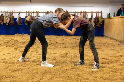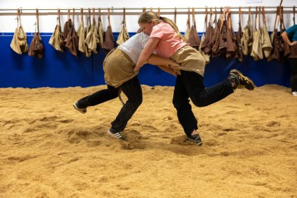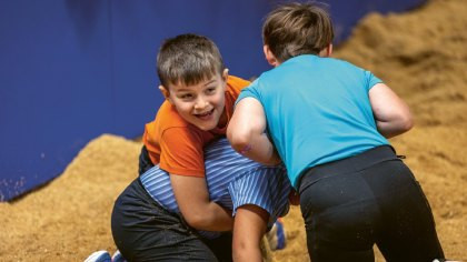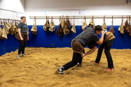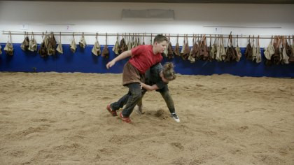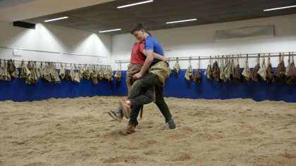 Ginnastica agli attrezzi – Anelli oscillanti Rugeli doppio in posizione raggruppata/oscillazione in avanti con successiva capriola all’indietro raggruppata verso l'oscillazione all'indietro in sospensione rovesciata