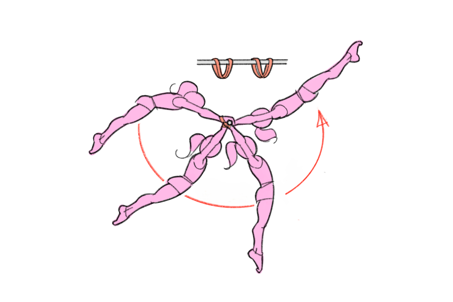 - Un fattore decisivo per poter bilanciare in alto è il momento giusto per eseguire la courbette. La courbette deve essere svolta (sia nello slancio in avanti, sia in quello indietro) dopo la linea verticale, affinché l’impulso vada verso l’alto.