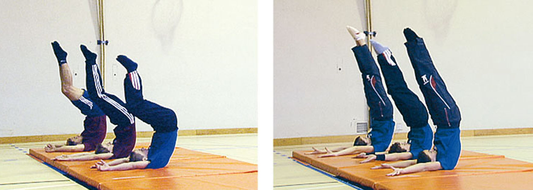 Position dorsale, bras tendus. Ramener rapidement les jambes au-dessus de la tête, de manière à garder un grand espace entre la tête et les genoux. Les pieds décrivent un cercle. La position finale est une chandelle, avec les jambes légèrement pliées et le regard dirigé vers les pieds.