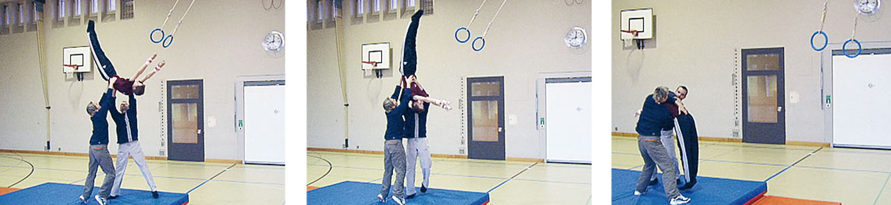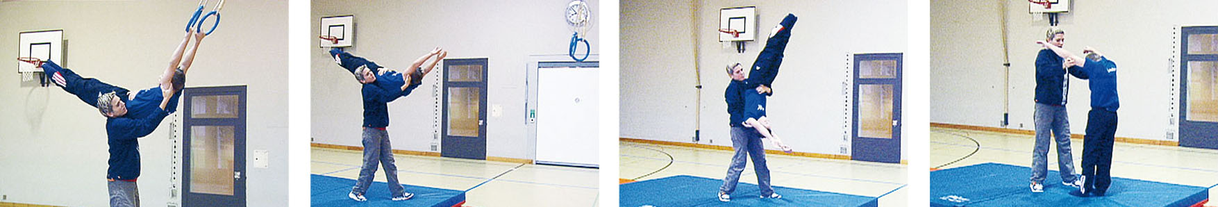 Anneaux à hauteur de bras tendus. Prendre un petit élan et s’arrêter avec les jambes sur l’épaule de l’enseignant en «posture C+» ( jambes tendues ou pliées). L’enseignant contrôle la justesse de la «posture C+»: regard dirigé vers les pieds, nombril rentré. Il donne ensuite le signal pour lâcher, avec la consigne de regarder toujours ses pieds, et il aide à terminer la rotation. L’élève reste en «posture C+» jusqu’à la réception sur le tapis.