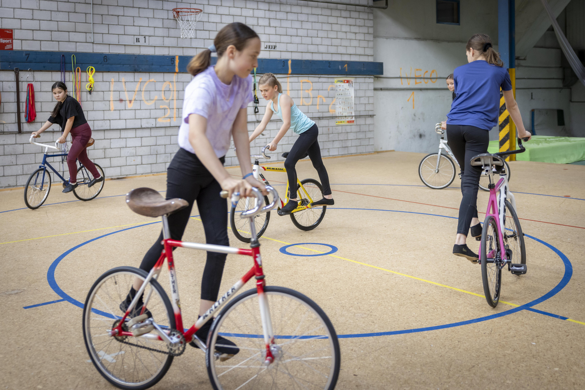 Die Teilnehmerinnen fahren zu Musik quer durch die Halle und versuchen, trotz verschiedenen Aufgaben rund zu treten. Sie fahren zum Beispiel abwechslungsweise langsam oder schnell im Takt zur Musik, treten sitzend mit einem Fuss, den anderen Fuss auf den Dornen oder im Seitenpedal-stand. Lieder wie Kalinka oder Sirtaki eignen sich besonders gut.