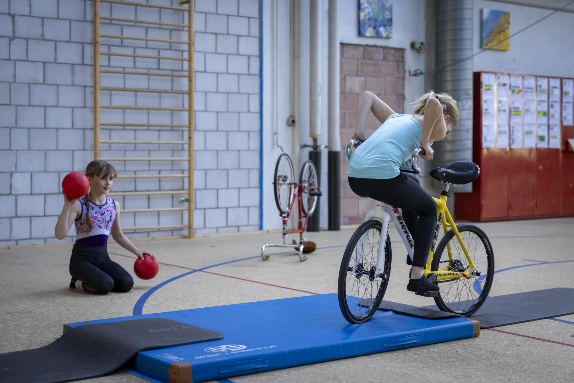 Die Kinder und Jugendlichen lernen, auf dem Kunstrad stillzustehen. Die Kinder und Jugendlichen lernen, auf dem Kunstrad stillzustehen.