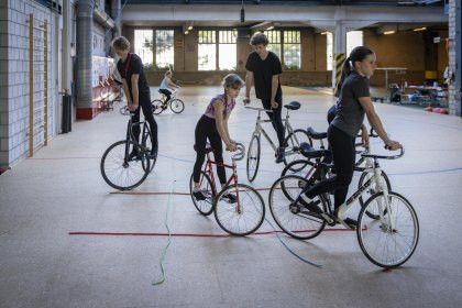 Die Kinder und Jugendlichen lernen, auf dem Kunstrad stillzustehen. Die Kinder und Jugendlichen lernen, auf dem Kunstrad stillzustehen.