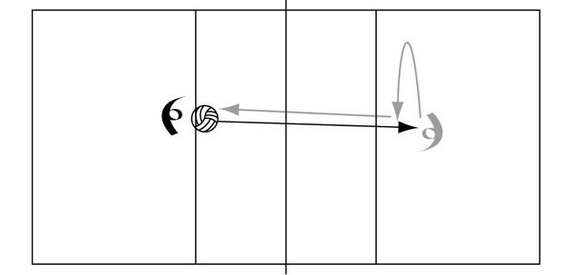 Deux joueurs de part et d’autre du filet enchaînent les attaques. Le but de cet exercice est de disposer d’une meilleure appréciation des trajectoires du ballon.